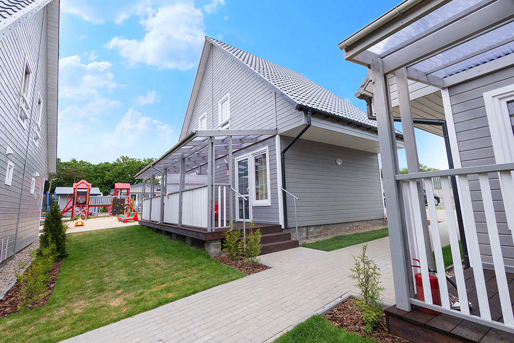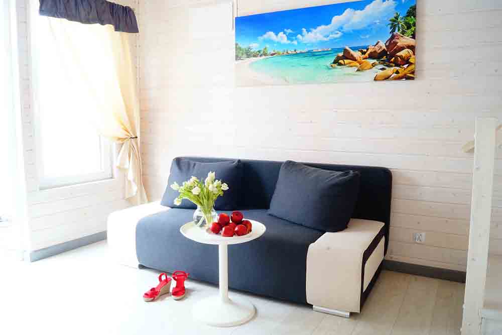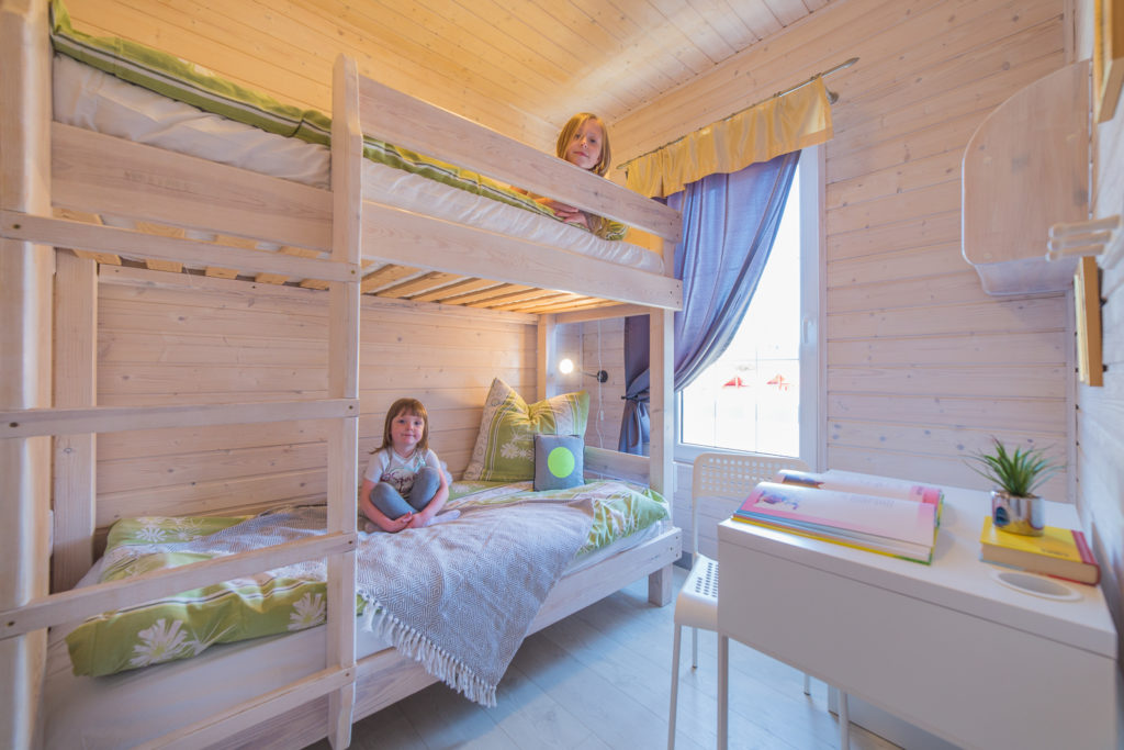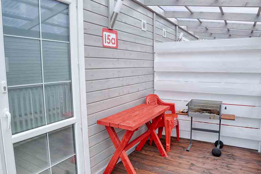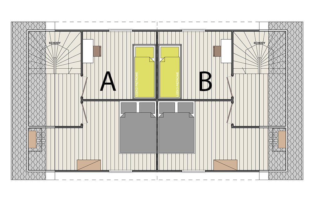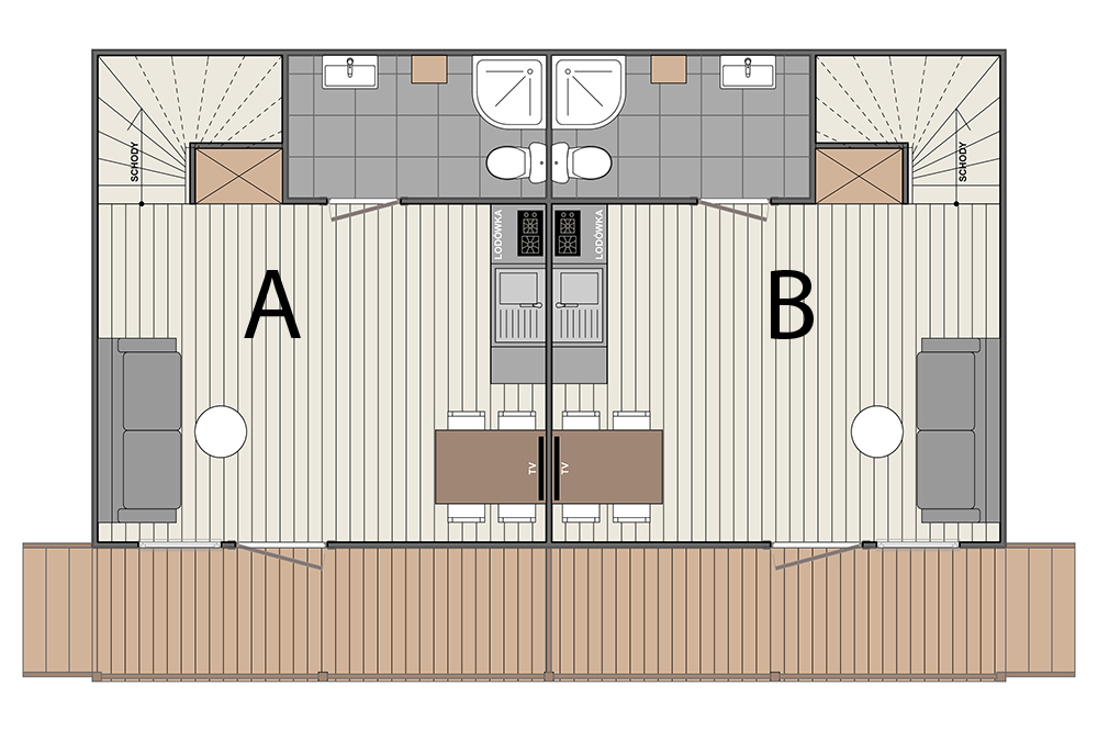 Domki Piętrowe Powierzchnia domku: około 42 m² Taras: około 6 m² Maksymalna liczba osób: 6 Pokój dzienny: rozkładana sofa 140×200 cm (z pościelą), odbiornik TV, szafa z wieszakami, stół z krzesłami Sypialnia główna: łóżko małżeńskie 140×200 cm, komoda, odbiornik TV, wieszak na ubrania, lampka nocna, pościel Sypialnia dla dzieci: łóżko piętrowe, biurko, krzesło, półka wisząca, wieszak, lampki nocne, pościel Aneks kuchenny: zabudowa meblowa, lodówka, kuchenka indukcyjna jednopalnikowa, mikrofala, czajnik bezprzewodowy, garnki, patelnia, talerze, sztućce, kubki, szklanki, deska do krojenia, ostry nóż Łazienka: prysznic, umywalka, toaleta, lustro, wieszaki na ręczniki, szafka na kosmetyki Taras: stół i krzesła Pozostałe: do dyspozycji grill Poprzedni Następny Rzuty domku Rzut ośrodka
